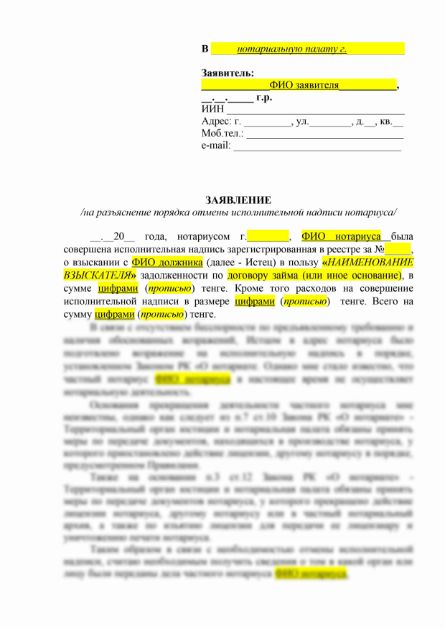 Если на момент подачи должником возражения против предъявленного взыскателем требования или обжалования в судебном порядке исполнительной надписи частный нотариус прекратил нотариальную деятельность, то возможность соблюдения порядка досудебного урегулирования спора утрачена. В этом случае обращение должника к нотариусу с возражением не требуется. Должник вправе обжаловать исполнительную надпись в суд с указанием в жалобе причины невозможности подачи возражения нотариусу. Жалоба подается в суд по последнему месту нахождения этого нотариуса с привлечением к участию в деле представителя нотариальной палаты в качестве заинтересованного лица. Одно из веских оснований для отмены исполнительной надписи этонеправильность совершения исполнительной надписи и её несоответствие требованиям Закона РК "О нотариате" и иных нормативных актов, регулирующих деятельность нотариуса.В нашем шаблоне максимально учтены все нарушения обычно допускаемые нотариусом.Шаблон искового заявления на отмену исполнительной надписи нотариуса Вы можете скачать по ссылке ниже. Шаблон обновлен по последним изменениям Закона РК "О нотариате".